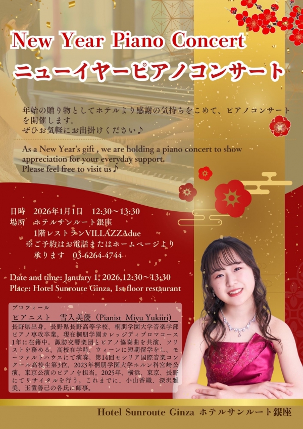 新年の幕開けにホテルより感謝の気持ちを込めてピアノコンサートを開催いたします。